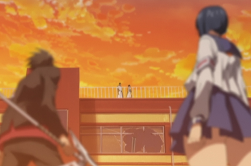 Later that night, Shusui and Ouka decide to face off against Kazuki and Tokiko in the school gym. They decide to wait a while until the night watchmen have finished their rounds so they will not be interrupted. He asks Kazuki if he can even fight as he looks unwell and asks if his claim to become as strong as possible was just a lie. Kazuki angrily replies that he wasn't lying and thought that they were friends that he had to protect, Shusui tells him that he doesn't need to protect them and that they just need to be strong enough to obtain what they desire the most.